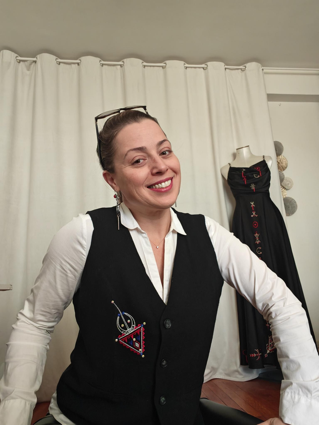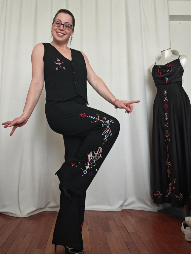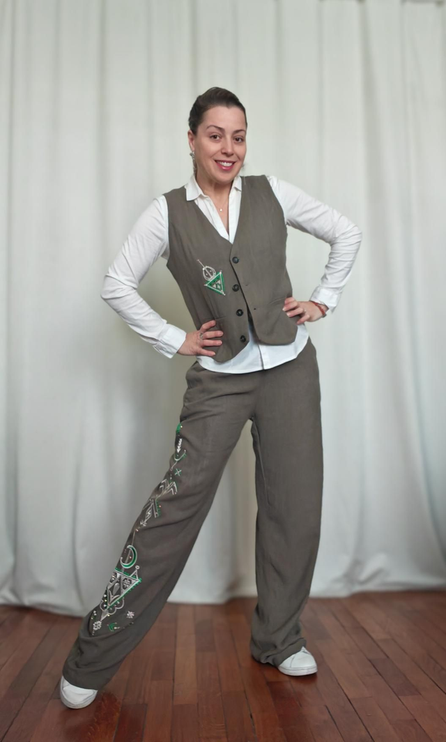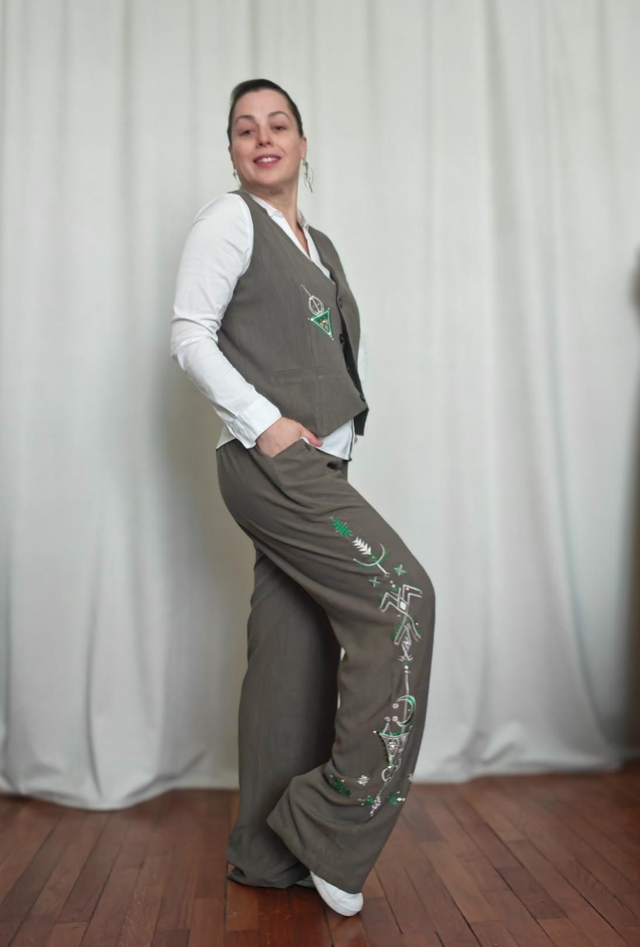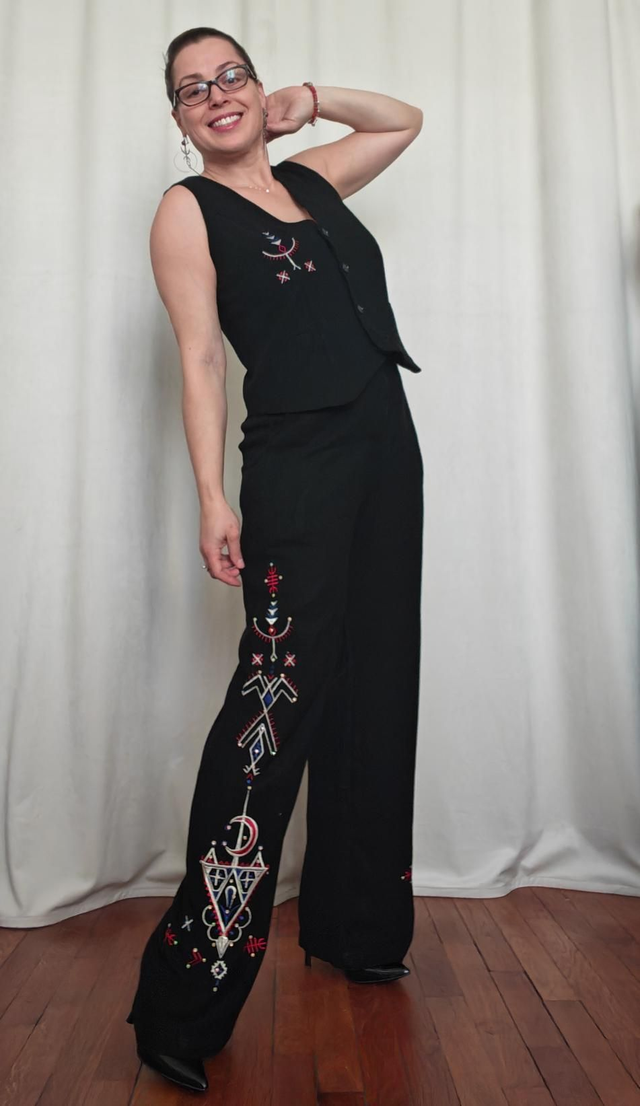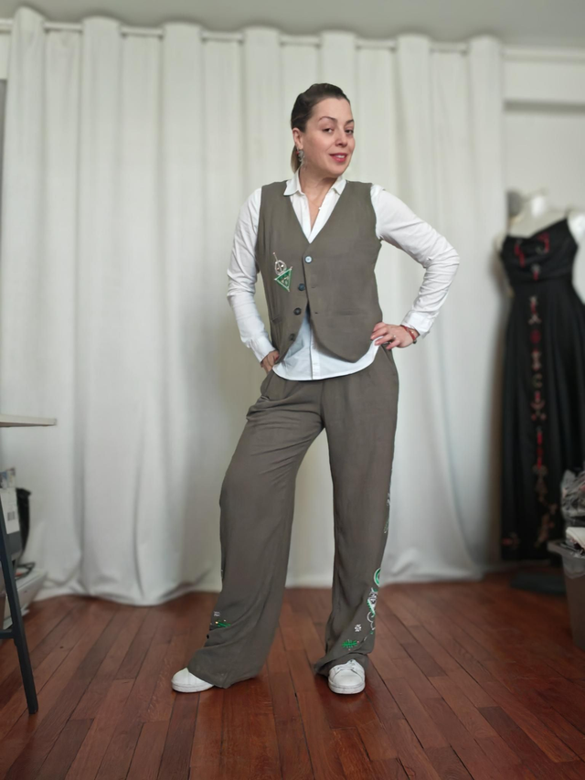 La broderie est sur le côté gauche du haut et sur les deux côtés du pantalon, qui a des poches italiennes très pratiques pour le quotidien.
